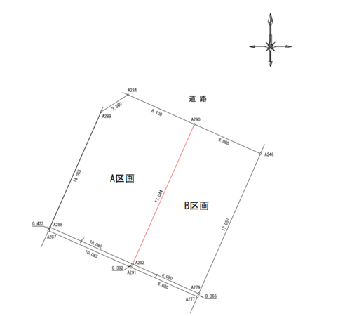 | 容積率 | 150% | 接道状況 | A区画…北側公道幅員約5mに約8.1m接道する B区画…北側公道幅員約5mに約8m接道する |